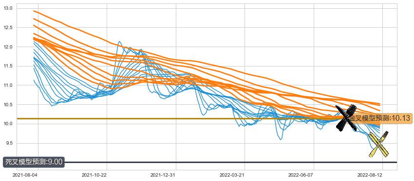 ➣ 60小时均线于(2022-07-11: 10.13)形成【死叉】基于【死叉历史模型】预测死叉后最低波谷价格: 8.98, 死叉后最低价格9.23,尚未达到预测最低波谷价格, 预期继续下跌