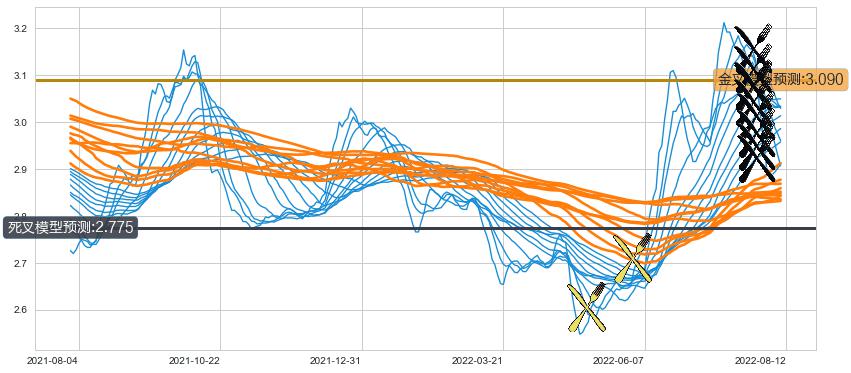 ➢ 60小时均线于(2022-08-01: 2.921)形成【死叉】基于【死叉历史模型】预测死叉后最低波谷价格: 2.657, 死叉后最低价格2.840,尚未达到预测最低波谷价格, 预期继续下跌