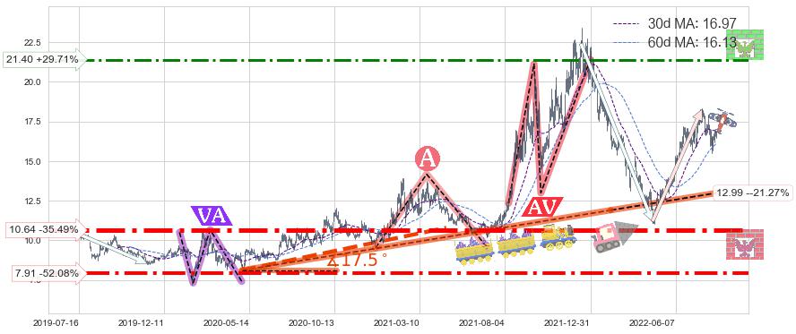 ♘ 阻力价格位21.40,可信任强度60.36%,距离最后交易2022-08-12形成的收盘价格16.50相差 +29.71%