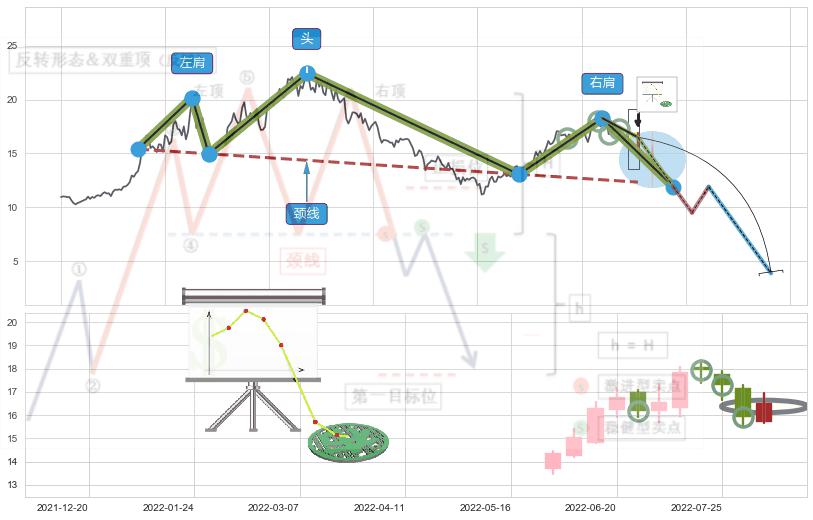 ➣ 头肩顶:猜想临近关键支撑位突破点 → 临近拐点下跌 → 风险信号 → 大趋势均值回复