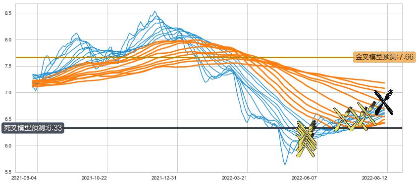 ➢ 10小时均线于(2022-08-11: 6.83)形成【死叉】基于【死叉历史模型】预测死叉后最低波谷价格: 6.40, 死叉后最低价格6.80,尚未达到预测最低波谷价格, 预期继续下跌