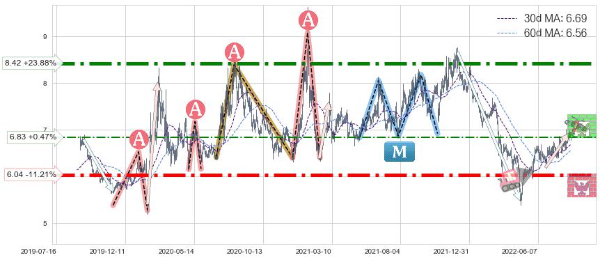 ♘ 支撑价格位6.04,可信任强度93.99%,距离最后交易2022-08-12形成的收盘价格6.80相差 -11.21%