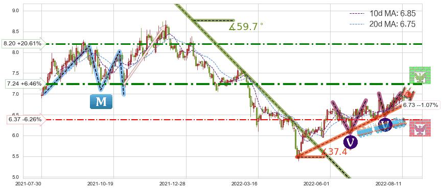 ➢ 【卖0】上涨趋势线在→(2022-08-15: 6.74 )被突破,反转趋势形成