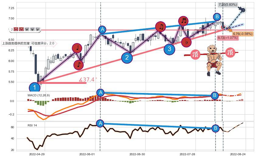 ♘ 阻力价格位7.24,可信任强度77.31%,距离最后交易2022-08-12形成的收盘价格6.80相差 +6.46%