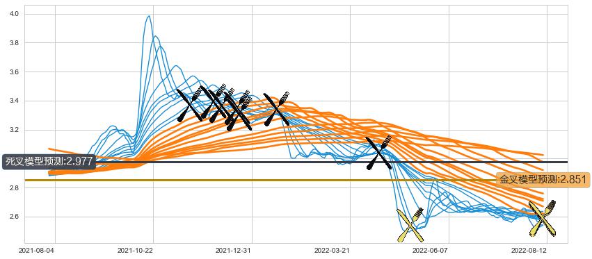 ➢ 34小时均线于(2022-08-11: 2.591)形成【金叉】基于【金叉历史模型】预测金叉后最高波峰价格: 2.847, 金叉后最高价格2.590,尚未达到预测最高波峰价格, 预期继续上涨