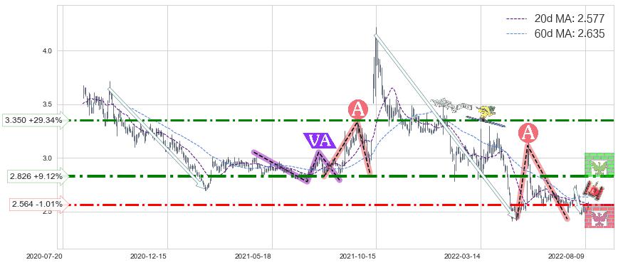 ♘ 阻力价格位2.826,可信任强度82.93%,距离最后交易2022-08-12形成的收盘价格2.590相差 +9.12%
