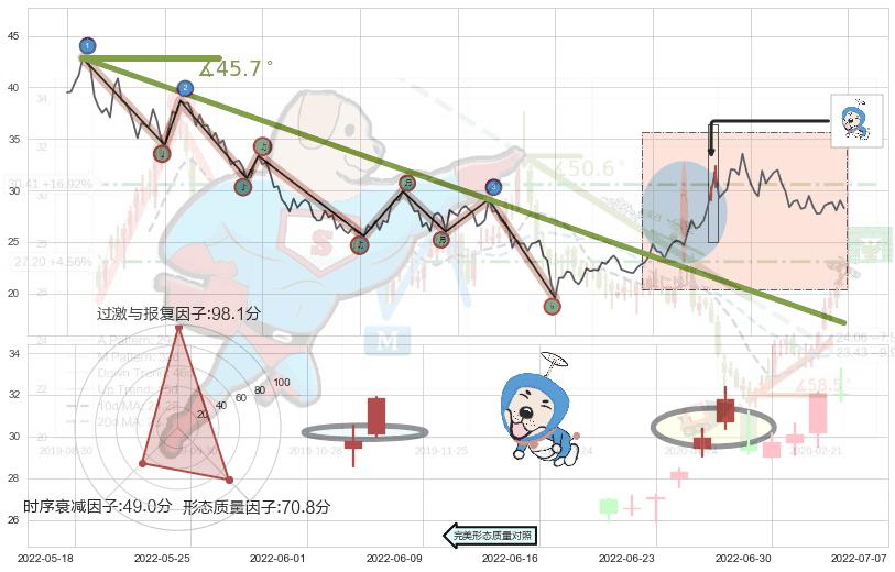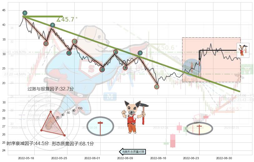 从2021-10-27至2022-05-19,共包含136个交易日,阶段股价下跌-53.59%,阶段股价变动位移路程比: 1 : 6,下跌趋势角度: 45.7