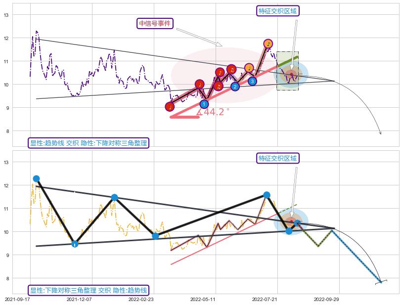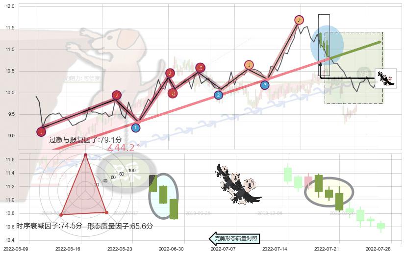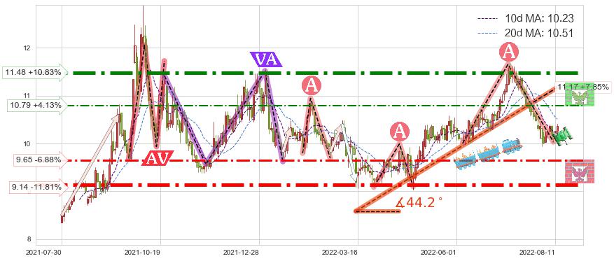 ➣ 2022-03-15-2022-07-22上升趋势存在反转[风险],其原上升趋势的支撑位(11.17)已破位[强阻力信号],原上升趋势角度: 44.2˚