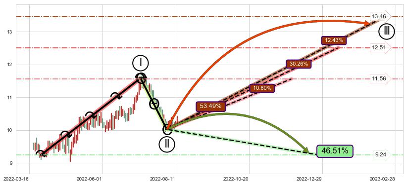♘ 支撑价格位9.14,可信任强度92.05%,距离最后交易2022-08-12形成的收盘价格10.36相差 -11.81%