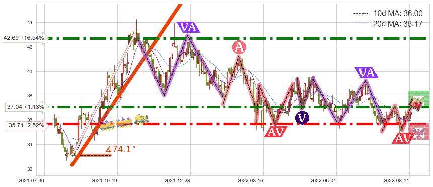 ♘ 阻力价格位37.04,可信任强度84.40%,距离最后交易2022-08-12形成的收盘价格36.63相差 +1.13%