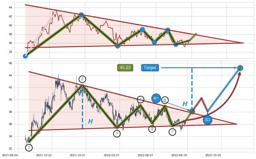 ➢ 最小中继整理涨幅→𝐇: 7.14 (高点逐步降低斜边第一阻力点②与支撑边垂直距离)