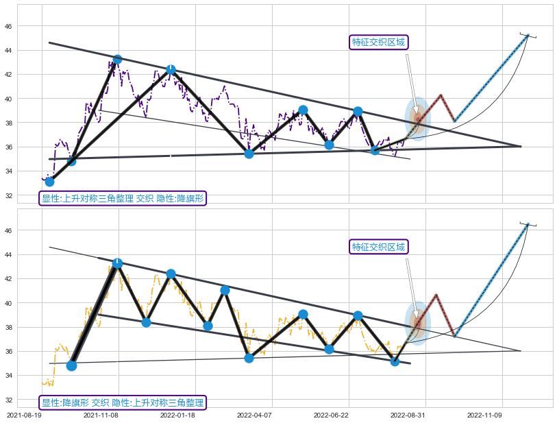 ➢ 上升对称三角整理与降旗形信号事件周期长度级别相同,同周期信号事件