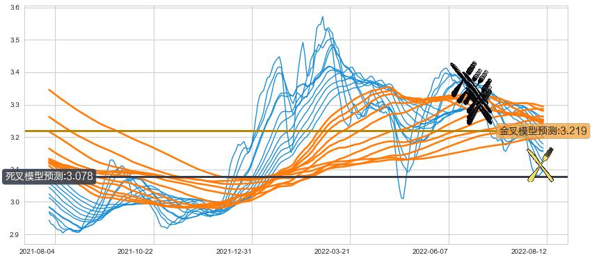 ➢ 34小时均线于(2022-06-24: 3.350)形成【死叉】基于【死叉历史模型】预测死叉后最低波谷价格: 3.191, 死叉后最低价格3.050,已经下跌超出预测最低波谷价格, 预期反弹