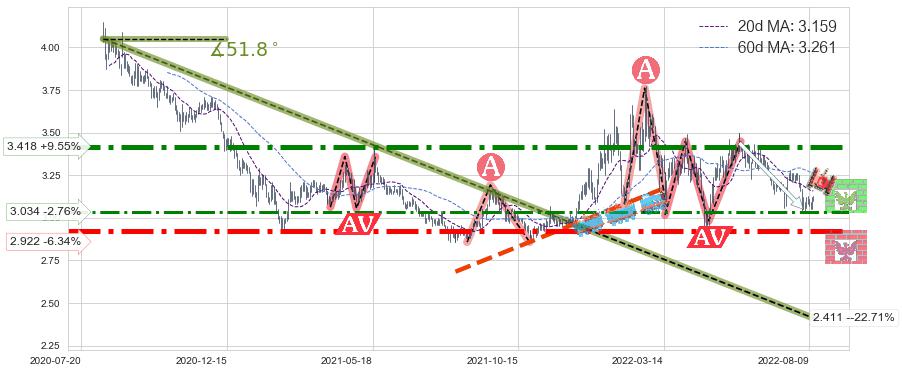 ♘ 阻力价格位3.034,可信任强度59.46%,距离最后交易2022-08-12形成的收盘价格3.120相差 -2.76%