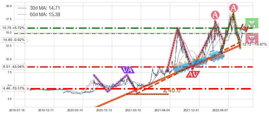 ♘ 阻力价格位15.79,可信任强度70.82%,距离最后交易2022-08-12形成的收盘价格14.94相差 +5.72%