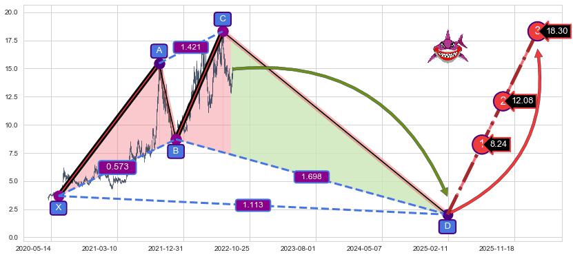 ➢ 谐波鲨鱼:b持续蓄力上拉击穿越过c:猜想泄力性下沉 → 下跌 →【拐点】强阻力临近 → 大趋势均值回复