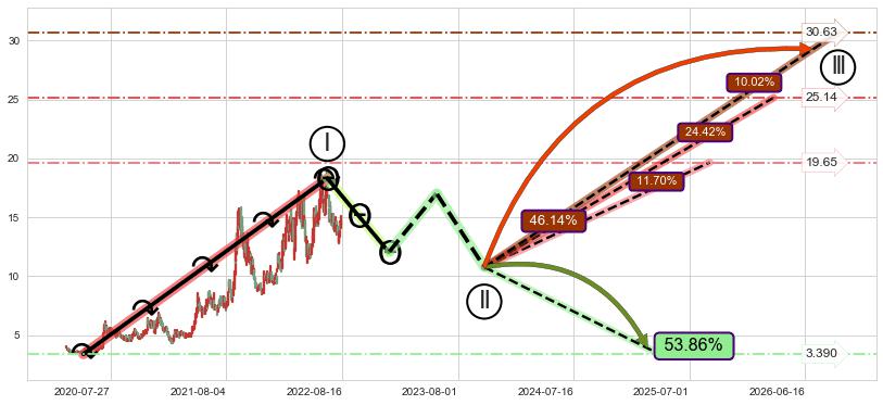 ➣ D点拟合预测价格2.020,距离最后交易收盘价格14.94相差 -86.48%