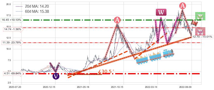 ♘ 支撑价格位14.74,可信任强度40.86%,距离最后交易2022-08-12形成的收盘价格14.94相差 -1.36%