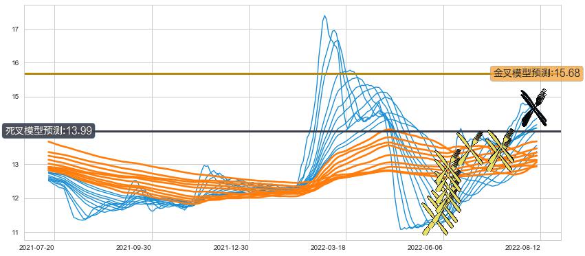 ➢ 10小时均线于(2022-08-10: 14.71)形成【死叉】基于【死叉历史模型】预测死叉后最低波谷价格: 13.97, 死叉后最低价格14.25,尚未达到预测最低波谷价格, 预期继续下跌