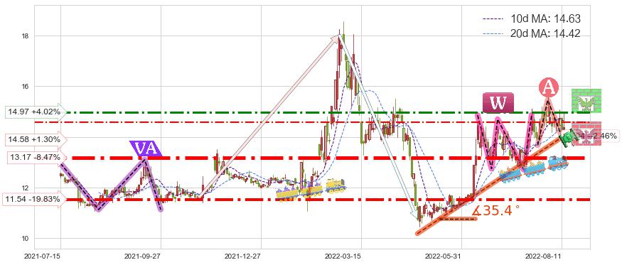 ♘ 支撑价格位14.58,可信任强度51.77%,距离最后交易2022-08-12形成的收盘价格14.39相差 +1.30%