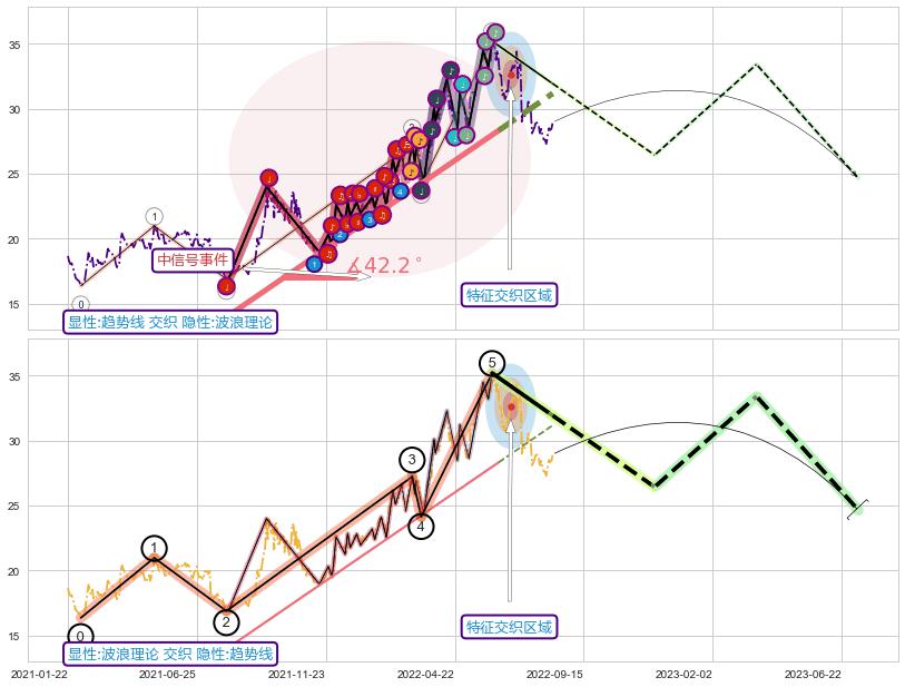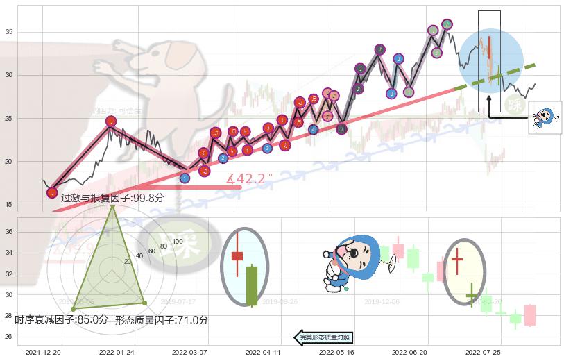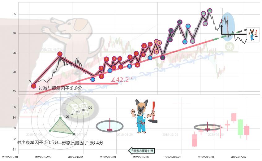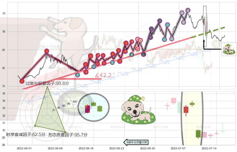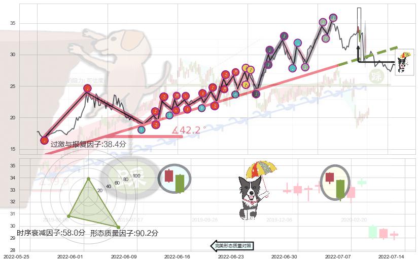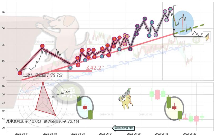 ➢ 2021-07-30-2022-06-15上升趋势存在反转[风险],其原上升趋势的支撑位(31.17)已破位[强阻力信号],原上升趋势角度: 42.2˚