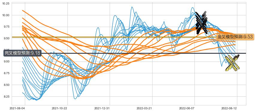 ➣ 55小时均线于(2022-06-17: 9.74)形成【死叉】基于【死叉历史模型】预测死叉后最低波谷价格: 9.11, 死叉后最低价格8.63,已经下跌超出预测最低波谷价格, 预期反弹