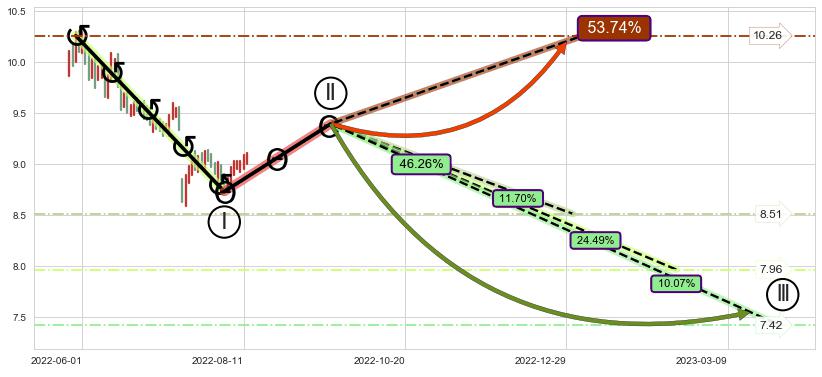 ➣ 循环浪继续向下【平均值】位置(2023-02-15, 7.96),匹配聚类样本比例52.93%, 可能性概率24.49%