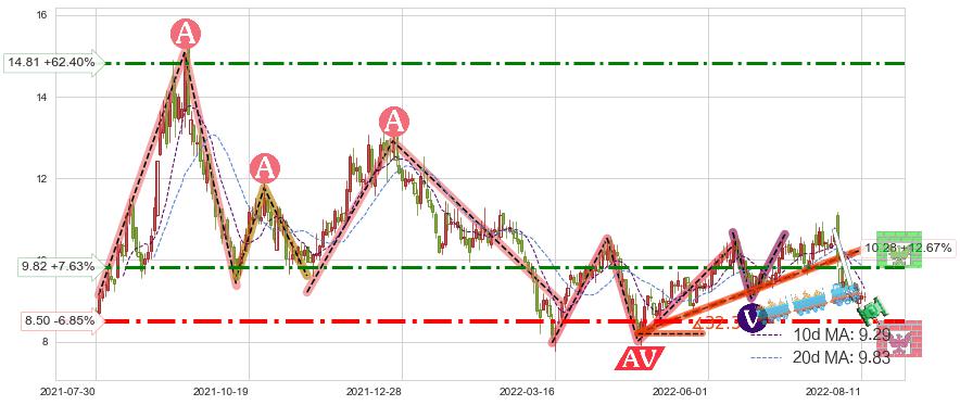 ♘ 阻力价格位9.82,可信任强度68.54%,距离最后交易2022-08-12形成的收盘价格9.12相差 +7.63%