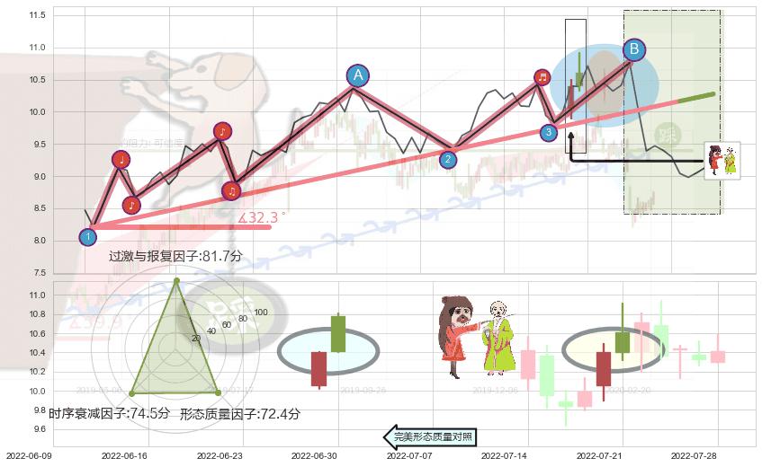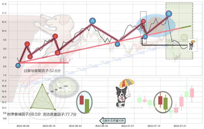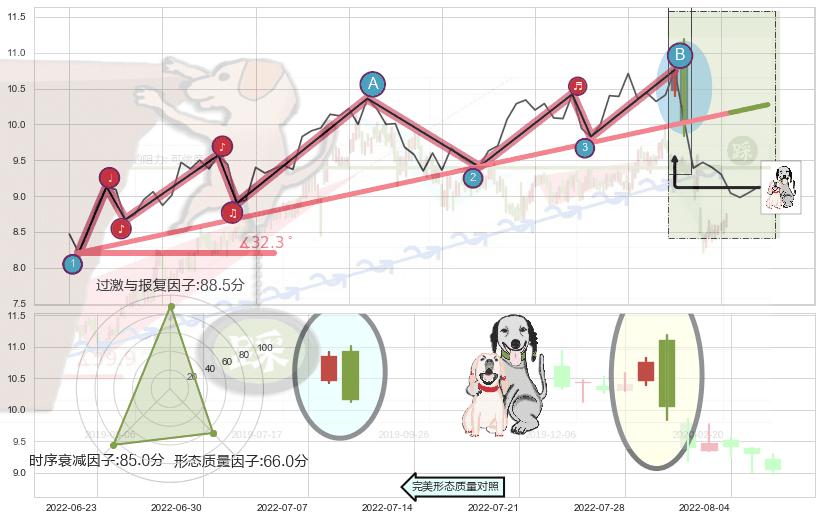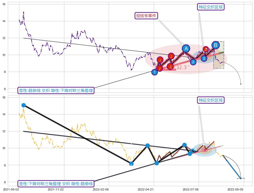 ➢ 2022-04-26-2022-08-08上升趋势存在反转[风险],其原上升趋势的支撑位(10.28)已破位[强阻力信号],原上升趋势角度: 32.3˚