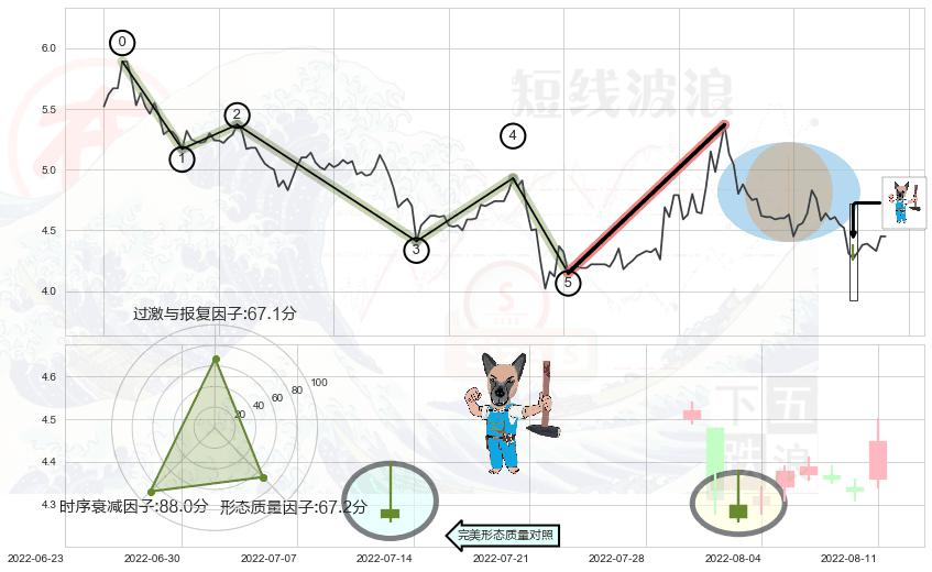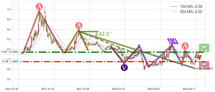 ♘ 阻力价格位4.87,可信任强度93.58%,距离最后交易2022-08-12形成的收盘价格4.45相差 +9.34%