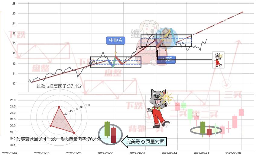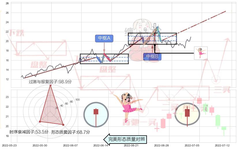➣ 【中枢B】:2022-06-17-2022-07-08,中枢由4笔构成,共16交易日, ZG=20.73, ZD=20.03