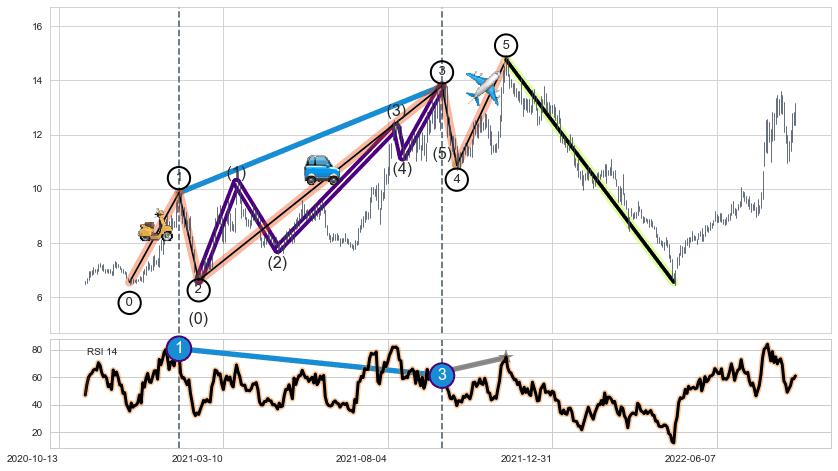 ➣ 第一, 三驱动浪端点:【RSI】走势出现【常规背离 & 反转信号】背离程度51.98%,背离夹角角度73.2˚,背离程度较小