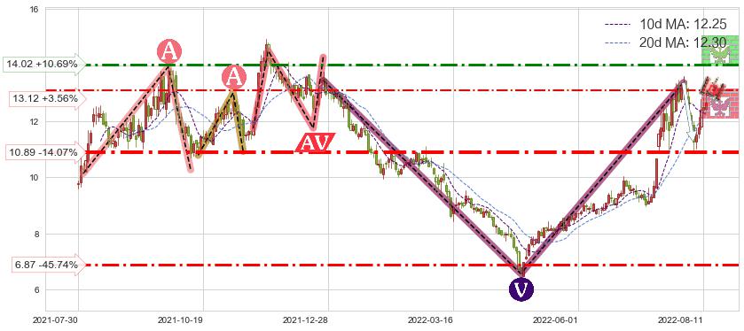♘ 阻力价格位14.02,可信任强度67.54%,距离最后交易2022-08-12形成的收盘价格12.67相差 +10.69%