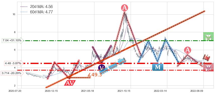 ♘ 支撑价格位4.48,可信任强度90.32%,距离最后交易2022-08-12形成的收盘价格4.66相差 -3.87%