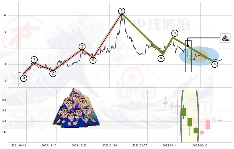 ➢ 高点影线(2022-04-19: 5.74 )→回踩→第一根k线低点(2022-04-15: 5.70 )