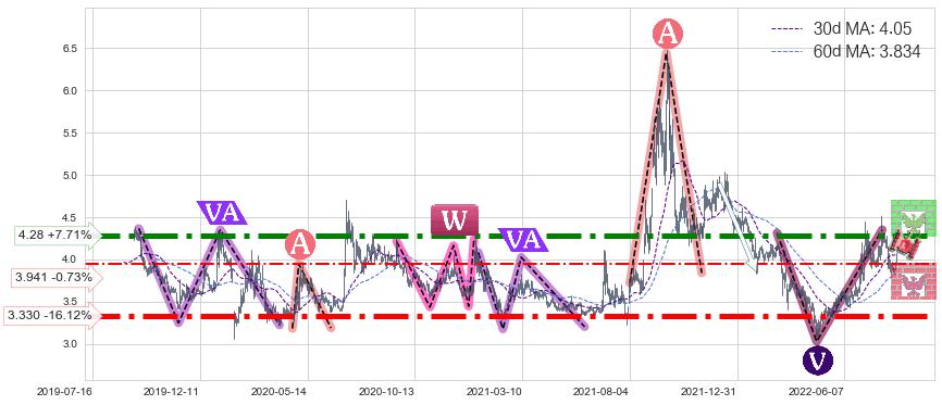 ♘ 阻力价格位4.28,可信任强度87.04%,距离最后交易2022-08-12形成的收盘价格3.970相差 +7.71%