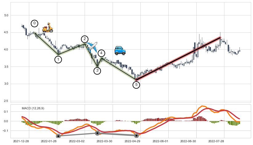 ➢ 波浪理论:猜想击穿突破c点后继续上涨 → 上涨 → 机会信号 → 小趋势跟踪