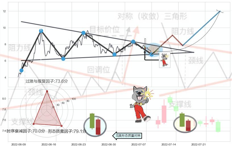 ➣ AI智能: 预测【多空区域上下窄幅震动→价格波动日益狭窄→多方占优】对称三角形中继整理向上突破,预测将在2022-08-29突破颈线, 演变成上升通道
