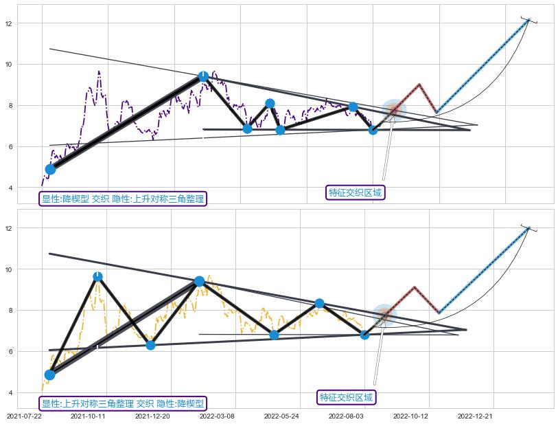 ➣ 上升对称三角整理:猜想临近关键阻力位突破点 → 临近拐点上涨 → 机会信号 → 大趋势均值回复