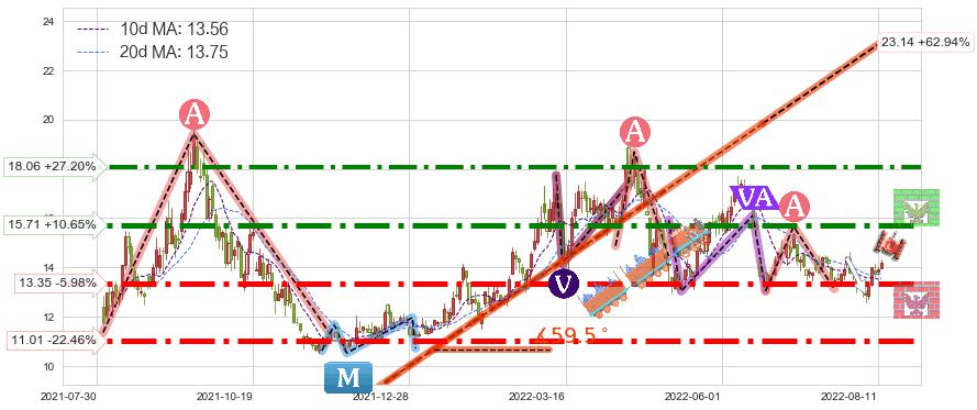 ♘ 阻力价格位15.71,可信任强度89.44%,距离最后交易2022-08-12形成的收盘价格14.20相差 +10.65%