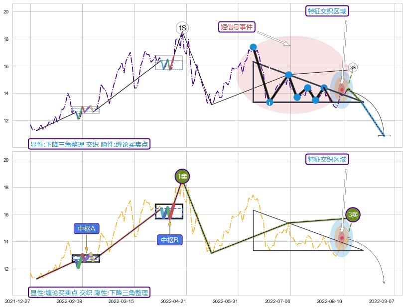 ➢ 【卖1】: 激进型 卖点→(2022-08-03: 13.34 )形成突破下降三角形整理【整理】形态