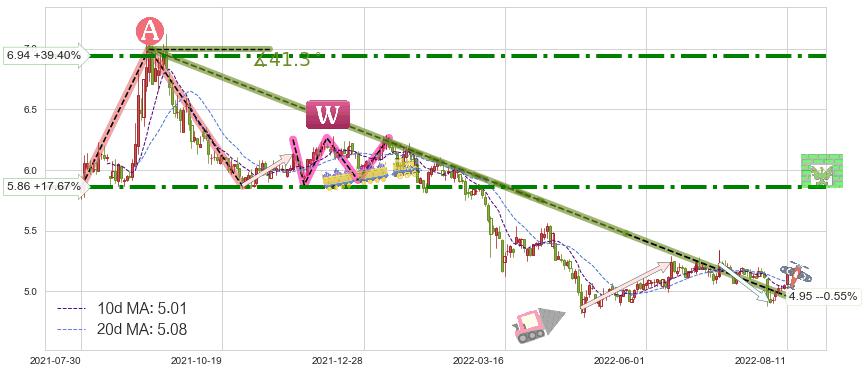 ➢ 【仅预测突破】最后价格:4.98与预测突破价格:5.14→【空间较大】后续最小【整理】第一目标价格→(2022-09-07: 5.52 )