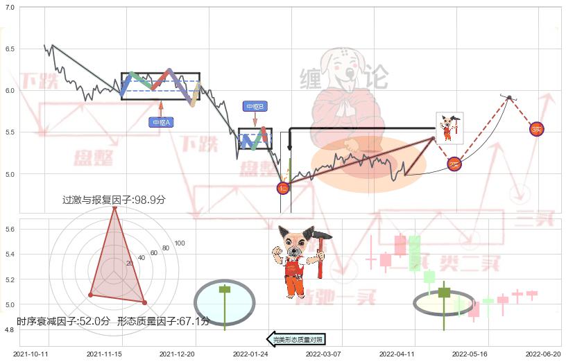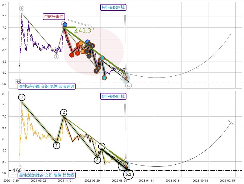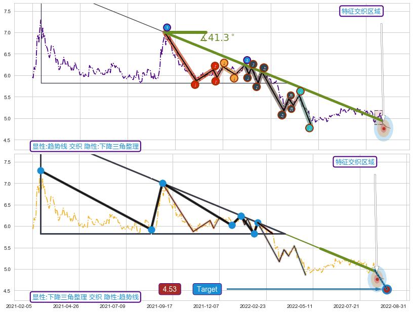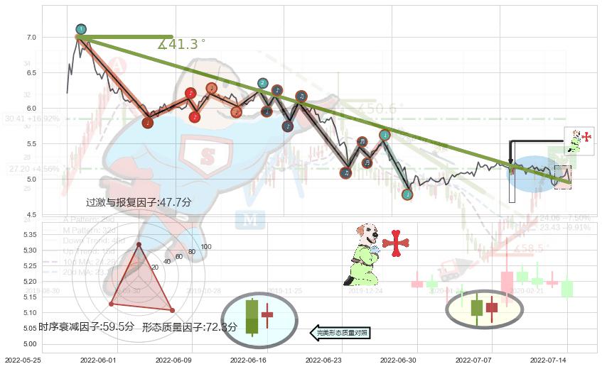 ➢ 2021-09-02-2022-05-23下跌趋势存在反转上涨[机会],虽然原下跌趋势的阻力位(4.95)已被突破,但其阻力效果尚存,原下跌趋势角度: 41.3˚