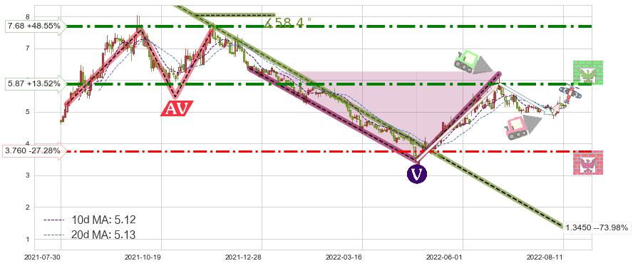 ♘ 阻力价格位7.68,可信任强度73.62%,距离最后交易2022-08-12形成的收盘价格5.17相差 +48.55%