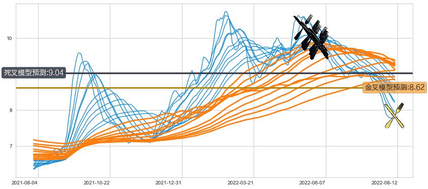➣ 70小时均线于(2022-05-30: 9.83)形成【死叉】基于【死叉历史模型】预测死叉后最低波谷价格: 8.93, 死叉后最低价格7.66,已经下跌超出预测最低波谷价格, 预期反弹