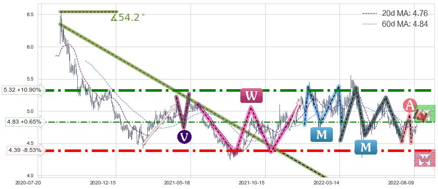 ♘ 阻力价格位4.83,可信任强度44.25%,距离最后交易2022-08-12形成的收盘价格4.80相差 +0.65%