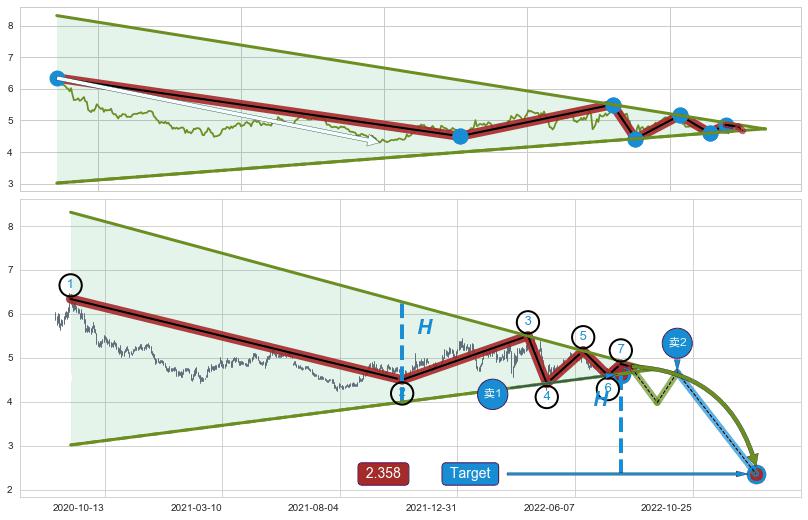 ➣ 下降对称三角整理:猜想临近关键支撑位突破点 → 临近拐点下跌 → 风险信号 → 大趋势均值回复