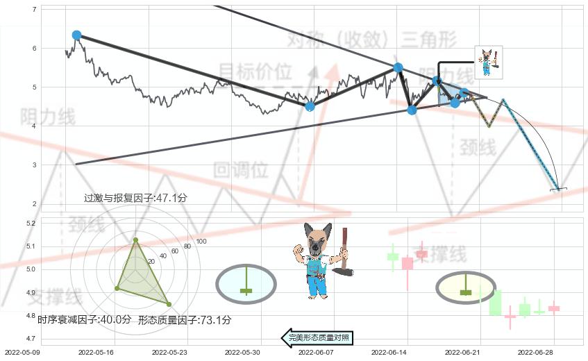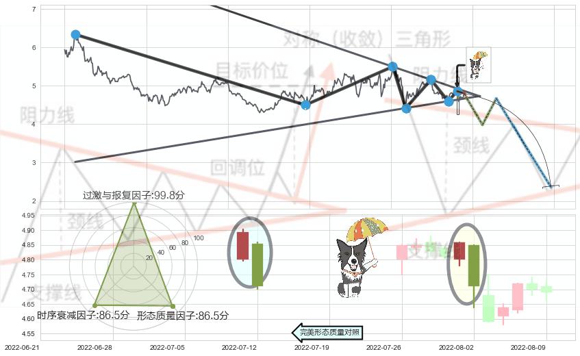 ➣ AI智能: 预测【多空区域上下窄幅震动→价格波动日益狭窄→空方占优】对称三角形中继整理向下突破,预测将在2022-08-01突破颈线, 演变成下降通道