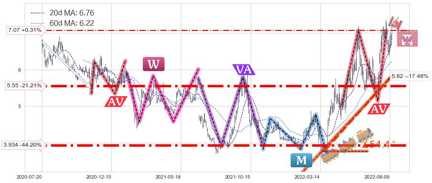 ♘ 支撑价格位5.55,可信任强度88.53%,距离最后交易2022-08-12形成的收盘价格7.05相差 -21.21%