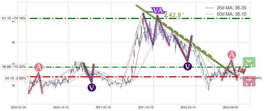 ♘ 阻力价格位38.66,可信任强度60.87%,距离最后交易2022-08-12形成的收盘价格35.08相差 +10.20%
